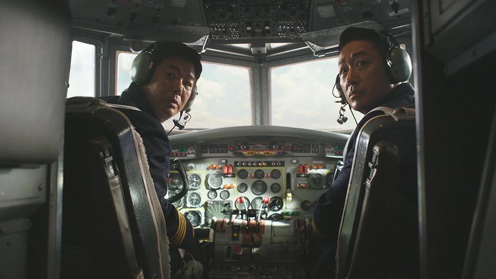 | ▲ This still image, provided by Kidari Studio on June 14, 2024, shows actors Sung Dong-il and Ha Jung-woo as the two pilots in the new Korean action-thriller "Hijack 1971." (PHOTO NOT FOR SALE) (Yonhap) |