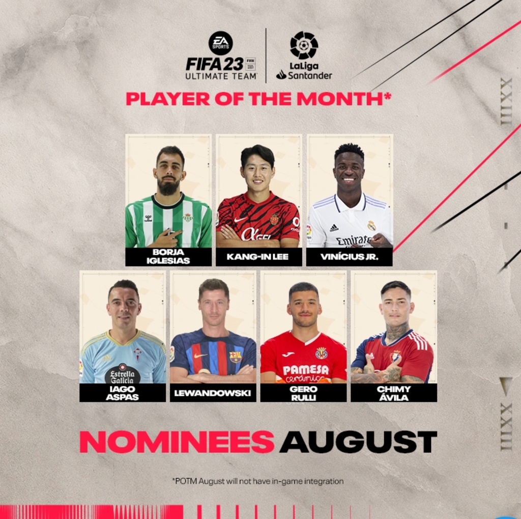 프리메라리가 사무국이 1일(한국시간) 발표한 2022-2023시즌 8월의 선수 후보에는 이강인과 로베르트 레반도프스키(FC바르셀로나), 보르하 이글레시아스(레알 베티스), 비니시우스 주니오르(레알 마드리드), 이아고 아스파스(셀타 비고), 헤로니모 룰리(비야레알), 에세키엘 아빌라(오사수나)까지 7명이 이름을 올렸다.