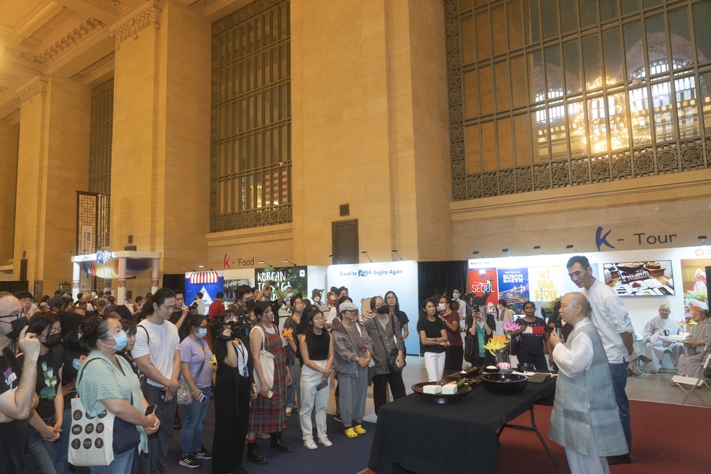 | ▲ 미국인들에게 사찰 음식 알리는 정관 스님 (뉴욕=연합뉴스) 22일(현지시간) 미국 뉴욕시 그랜드센트럴역에서 열린 한국문화관광 페스티벌에서 미국인들에게 한국의 사찰음식 설명하는 정관 스님. 2022.8.22. [한국관광공사 뉴욕지사 제공. 재판매 및 DB 금지] |