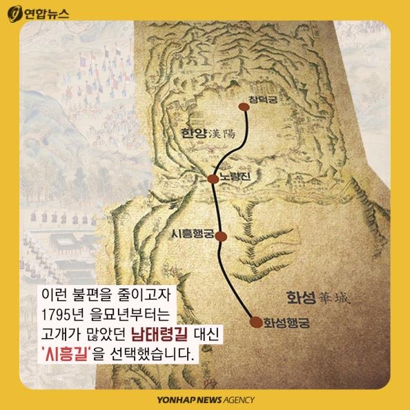 이런 불편을 줄이고자 1795년 을묘년부터는 고개가 많았던 남태령길 대신 시흥길을 선택했습니다.