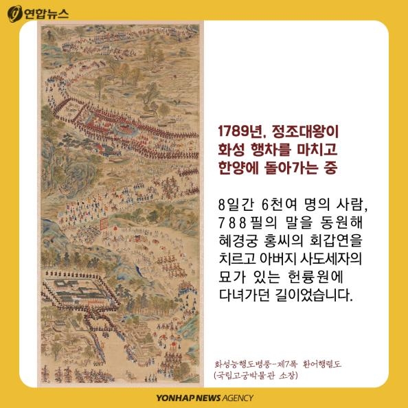 1789년, 정조대왕이 화성 행차를 마치고 한양으로 돌아가는 중 8일간 6천여 명의 사람, 788필의 말을 동원해 혜경궁 홍씨의 회갑연을 치르고 아버지 사도세자의 묘가 있는 현륭원에 다녀가던 길이었습니다.