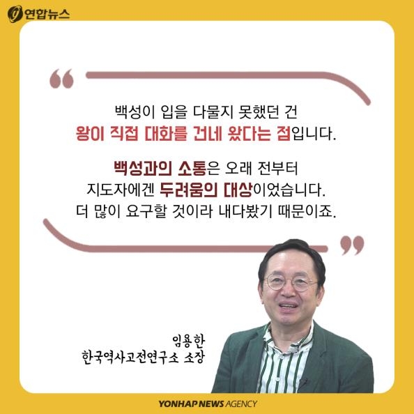 "백성이 입을 다물지 못했던 건 왕이 직접 대화를 건네 왔다는 점입니다. 백성과의 소통은 오래전부터 지도자에겐 두려움의 대상이었습니다. 더 많이 요구할 것이라 내다봤기 때문이죠."