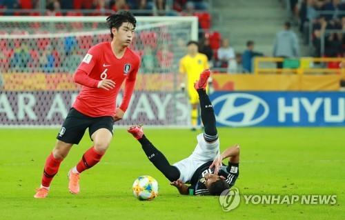 | ▲ In this file photo from May 31, 2019, Kim Jung-min of South Korea (L) dribbles the ball against Argentina during the teams' Group F match at the FIFA U-20 World Cup at Tychy Stadium in Tychy, Poland. (Yonhap) |
