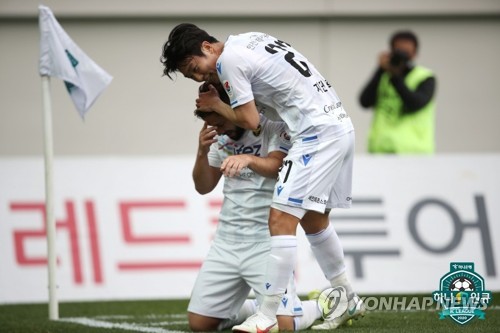 ▲ Elisa Aguilar of Incheon United (L) is congratulated by teammate Ji Eon-hak after scoring a goal against FC Seoul during a K League 1 match at Seoul World Cup Stadium in Seoul on Oct. 31, 2020, in this photo provided by the Korea Professional Football League. (PHOTO NOT FOR SALE) (Yonhap)
