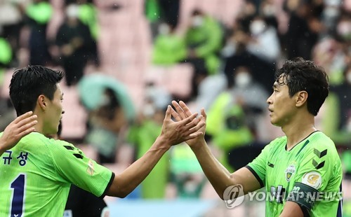 | ▲ Cho Gue-sung of Jeonbuk Hyundai Motors (L) high-fives teammate Lee Dong-gook after scoring his second goal against Daegu FC during a K League 1 match at Jeonju World Cup Stadium in Jeonju, 240 kilometers south of Seoul, on Nov. 1, 2020. (Yonhap) |
