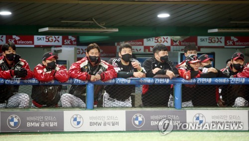 | ▲ LG Twins players watch their team in action against the SK Wyverns in a Korea Baseball Organization regular season game at SK Happy Dream Park in Incheon, 40 kilometers west of Seoul, on Oct. 30, 2020. (Yonhap) |