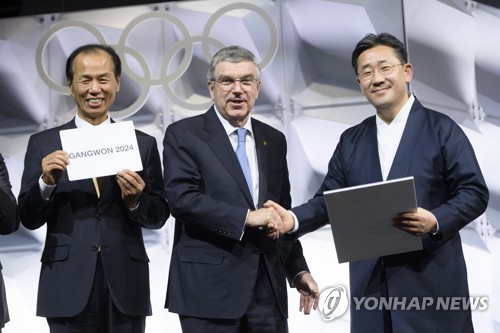 | ▲ In this EPA file photo from Jan. 10, 2020, Choi Moon-soon (L), governor of South Korea's Gangwon Province, holds a card showing the name of Gangwon Province of South Korea as the host of the 2024 Winter Youth Olympics, following an election at the 135th International Olympic Committee (IOC) Session in Lausanne, Switzerland. Others with Lee are Thomas Bach (C), president of the IOC, and Park Yang-woo, South Korean minister of culture, sports and tourism. (Yonhap) |