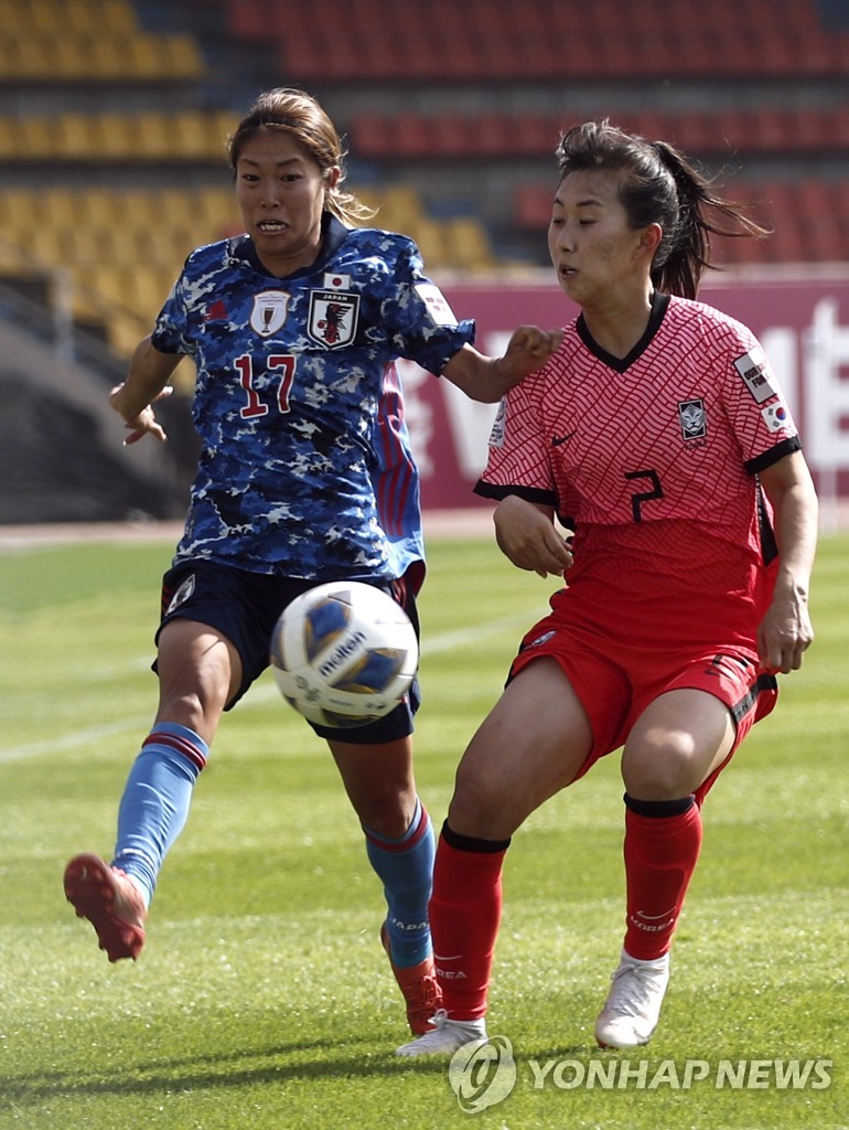 | ▲ In this Reuters photo, Choo Hyo-joo of South Korea (R) battles Yui Narumiya of Japan for the ball during the teams' Group C match at the Asian Football Confederation Women's Asian Cup at Shree Shiv Chhatrapati Sports Complex in Pune, India, on Jan. 27, 2022. (Yonhap) |