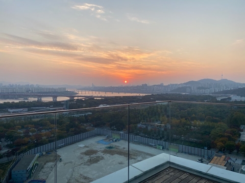 (서울=연합뉴스) 임미나 기자 = 26일 오후 5시 30분께 서울 성동구 성수동 '클리오' 사옥 14층 테라스에서는 붉은 해가 한강 서쪽으로 뉘엿뉘엿 지는 모습을 한 폭의 그림처럼 감상할 수 있었다.