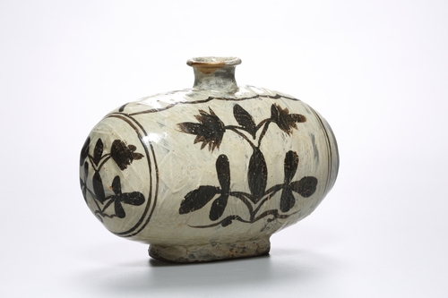 철화기법의 추상적인 당초문양이 그려진 장군과 먹이를 두고 두 마리의 물고기가 서로 대치하는 상황이 생동감 있게 묘사된 유물이 이채롭다.