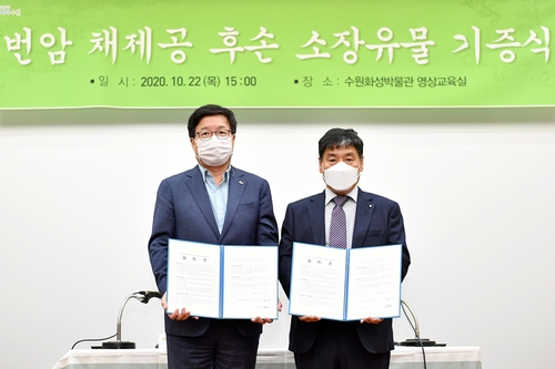 (수원=연합뉴스) 김인유 기자 = 조선 정조때의 충신이자 명재상으로 이름을 떨친 번암 채제공(樊巖 蔡濟恭:1720~1799) 선생의 후손이 보물을 포함한 유물 1천854점을 수원화성박물관에 기증했다.