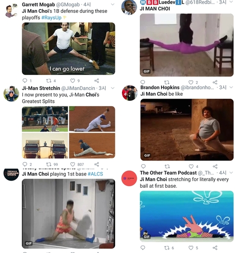 또 최지만이 다리를 찢는 모습과 닮은 애니메이션이나 영화의 한 장면을 담은 밈(Meme·인터넷에서 유행어와 행동 따위를 모방하여 만든 사진이 영상)도 확산하고 있다.
