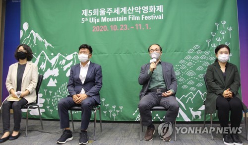 | ▲ 울주세계산악영화제 비대면 개막 발표 (울산=연합뉴스) 장영은 기자 = 9월 16일 울산시청 프레스센터에서 제5회 울주세계산악영화제 10월 23일 개막 발표 기자회견이 열린 가운데 배창호 집행위원장이 기자 질문에 답하고 있다. 왼쪽부터 김세진 프로그래머, 이선호 이사장, 배 위원장, 이정진 프로그래머. 올해 울주산악영화제는 10일 동안 개최되며, 비대면 온라인 유료 상영, 자동차 극장 상영 방식으로 진행된다. [연합뉴스 자료사진] |