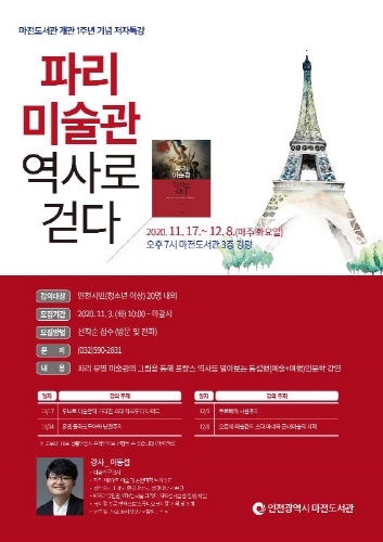인천광역시(시장 박남춘) 마전도서관은 개관 1주년을 맞아 '파리로망스', '파리 미술관 역사로 걷다, '다빈치 인생 수업' 등을 저술한 이동섭 작가를 초청해 '파리 미술관, 역사로 걷다' 강연을 진행한다.