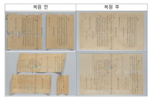 국가기록원 복원팀은 조각을 일일이 맞춰 14장의 온전한 기록을 완성하고 오염물질 제거 후 천연 염색한 한지를 이용해 원래의 모습으로 복원했다. 복원에만 4개월이 걸렸다고 기록원은 전했다.
