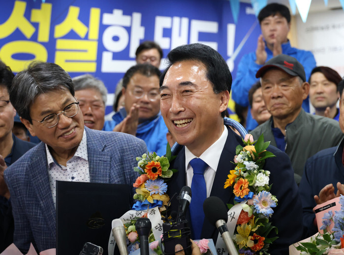 Park Soo-hyun, a former presidential spokesman for former President Moon Jae-in and a candidate of the main opposition Democratic Party in the Gongju-Buyeo-Cheongyang district, reacts at his election office on April 11, 2024, as his victory in the general elections was confirmed. (Pool photo) (Yonhap)