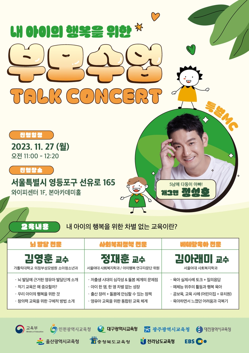 콘서트에서는 교육 전문가들이 영유아 자녀를 둔 부모를 대상으로 아이들의 뇌 발달단계에 맞는 맞춤형 교육, 놀이법 체험, 교육 환경의 중요성 등을 전할 예정이다. 진행은 코미디언 정성호가 맡는다.