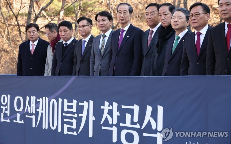 | ▲ 설악산 오색지구 케이블카 착공식 (양양=연합뉴스) 황광모 기자 = 한덕수 국무총리와 김진태 강원도지사 등 내빈들이 20일 강원도 양양군 오색리에서 열린 국립공원 설악산 오색지구 케이블카 착공식에서 케이블카 모양의 키를 조형물에 넣는 착공 의식을 하고 박수치고 있다. 2023.11.20 hkmpooh@yna.co.kr |