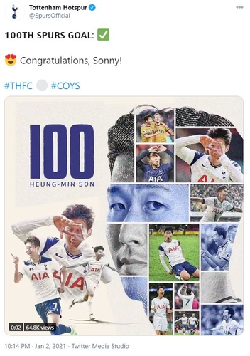 | ▲ 손흥민의 100호 골을 축하한 토트넘 구단 [토트넘 구단 트위터 캡처. 재판매 및 DB 금지] |