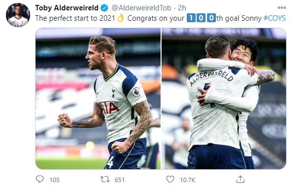 이날 손흥민의 도움을 받아 추가 득점을 기록한 토비 알데르베이럴트는 "2021년의 완벽한 시작이다. 손흥민의 100호 골을 축하한다!"며 동료애를 드러냈다.