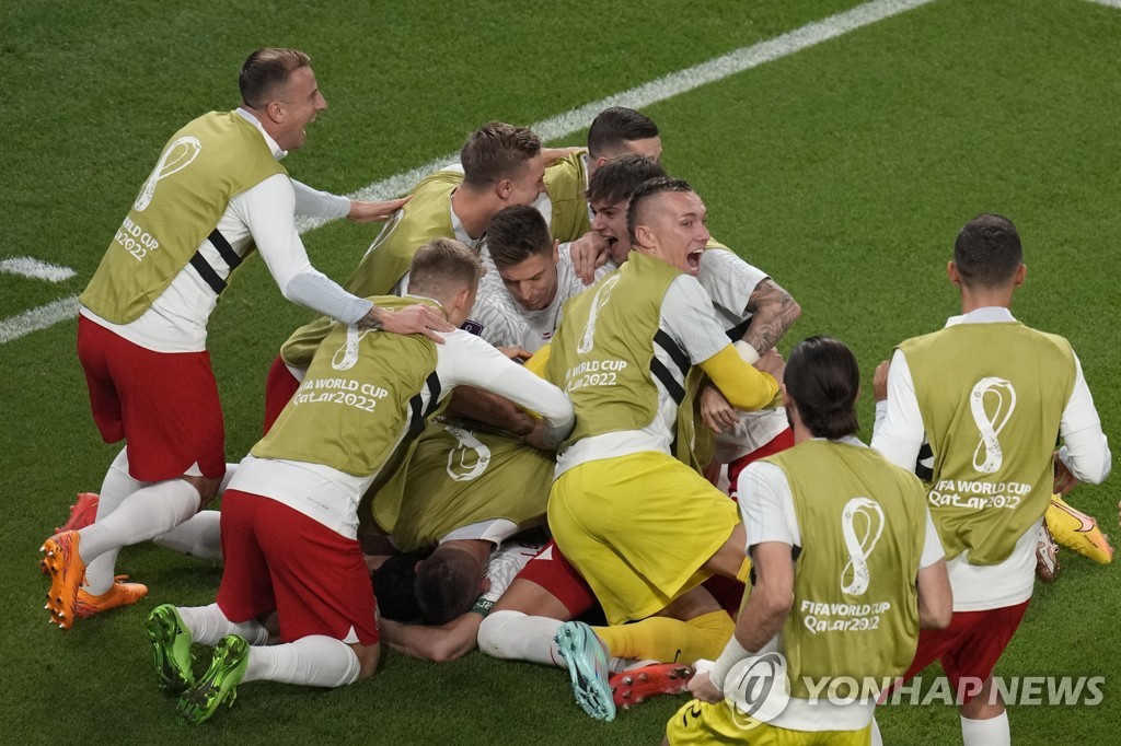 | ▲ 레반도프스키 득점에 기뻐하는 폴란드 동료들 (알라이얀 AP=연합뉴스) 레반도프스키가 26일 카타르 알라이얀 에듀케이션 시티 스타디움에서 열린 2022 국제축구연맹(FIFA) 카타르 월드컵 조별리그 C조 2차전 사우디아라비아와의 경기에서 개인 첫 월드컵 본선 득점에 성공하자 폴란드 동료들이 달려와 기뻐하고 있다. |
