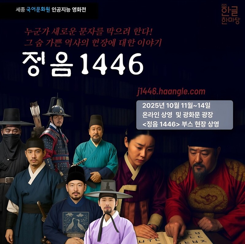 (서울=연합뉴스) 김예나 기자 = 세종국어문화원은 이달 11∼14일 서울 광화문광장에서 열리는 '2025 한글한마당' 행사에서 인공지능(AI) 기술을 활용한 영화 '정음1446'을 상영한다고 8일 밝혔다.