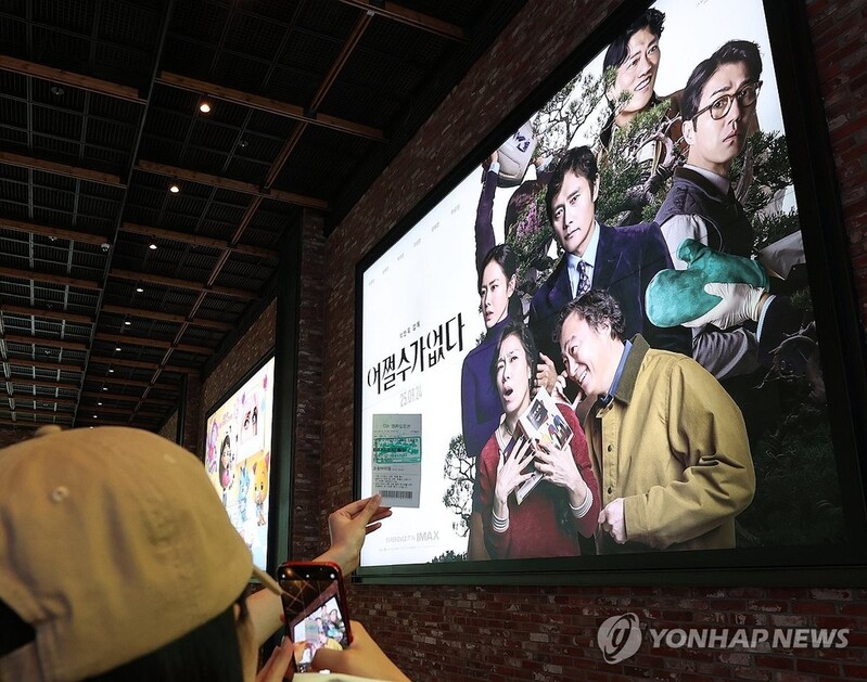 | ▲ A moviegoer takes a photo of their ticket with a "No Other Choice" poster in the background at a Seoul cinema on Sept. 25, 2025. (Yonhap) |