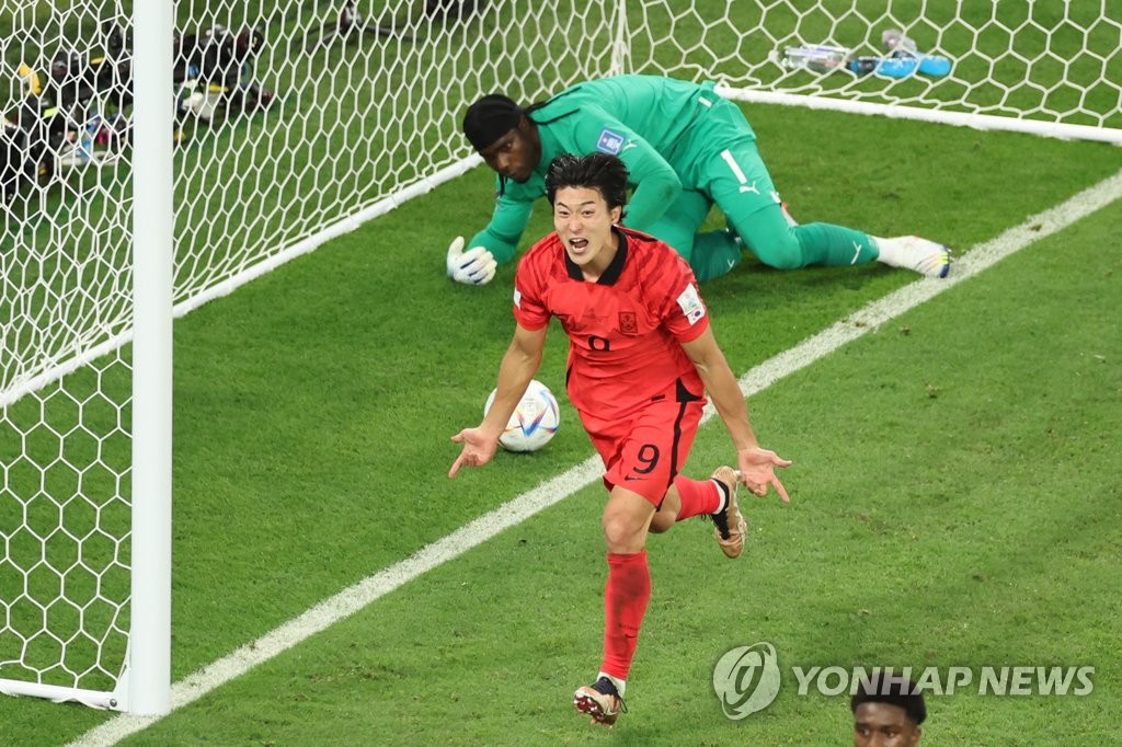 | ▲ 환호하는 조규성 (알라이얀=연합뉴스) 김주성 기자 = 28일 오후(현지시간) 카타르 알라이얀의 에듀케이션 시티 스타디움에서 열린 2022 카타르 월드컵 조별리그 H조 2차전 대한민국과 가나의 경기. 조규성이 선제골에 이어 동점 헤더골을 넣은 뒤 환호하고 있다. 2022.11.29 utzza@yna.co.kr |
