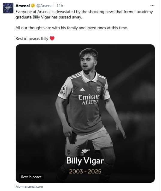 | ▲ 구단 산하 유소년팀 선수였던 빌리 비가르의 사망 소식에 애도를 표한 아스널. [아스널 구단 SNS. 재판매 및 DB 금지] |