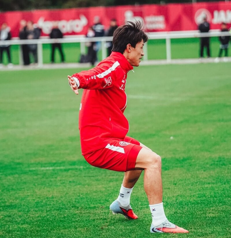 사진에는 붉은색 훈련복을 입은 이재성은 태극기가 선명하게 새겨진 흰색 양말을 신고 훈련하는 모습이 찍혔다.