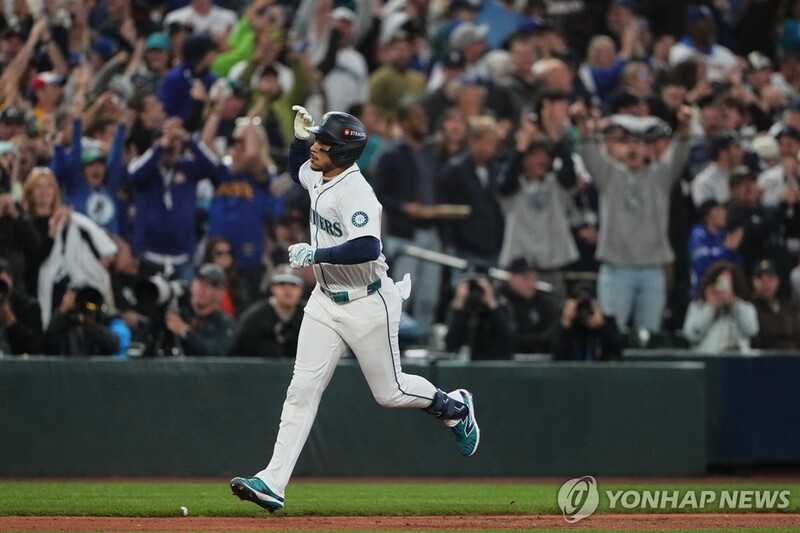 ▲ 폴랑코의 홈런 세리머니 (시애틀 AP=연합뉴스) 시애틀의 폴랑코가 6일(한국시간) 미국 워싱턴주 시애틀 T모바일파크에서 열린 MLB ALDS 2차전 디트로이트와 홈 경기, 6회 솔로 홈런을 친 뒤 그라운드를 돌고 있다.
