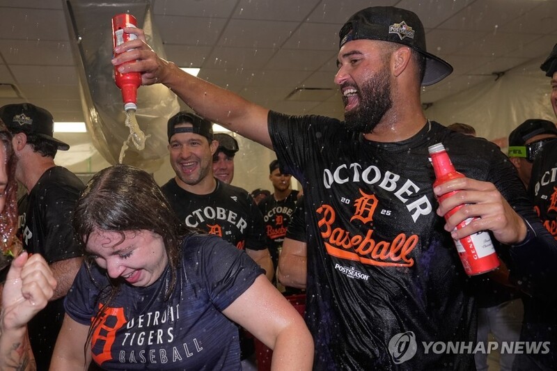 | ▲ 디비전시리즈 진출을 축하하는 디트로이트 선수단. [AP=연합뉴스] |