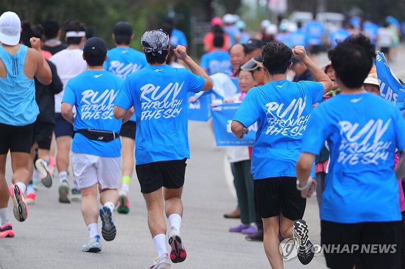 | ▲ 주민 여러분 감사합니다 (춘천=연합뉴스) 류호준 기자 = 개천절인 3일 강원 춘천시 남산면 일원에서 열린 2025 춘천연합마라톤 참가자들이 주민들의 응원에 화답하고 있다. 2025.10.3 ryu@yna.co.kr |