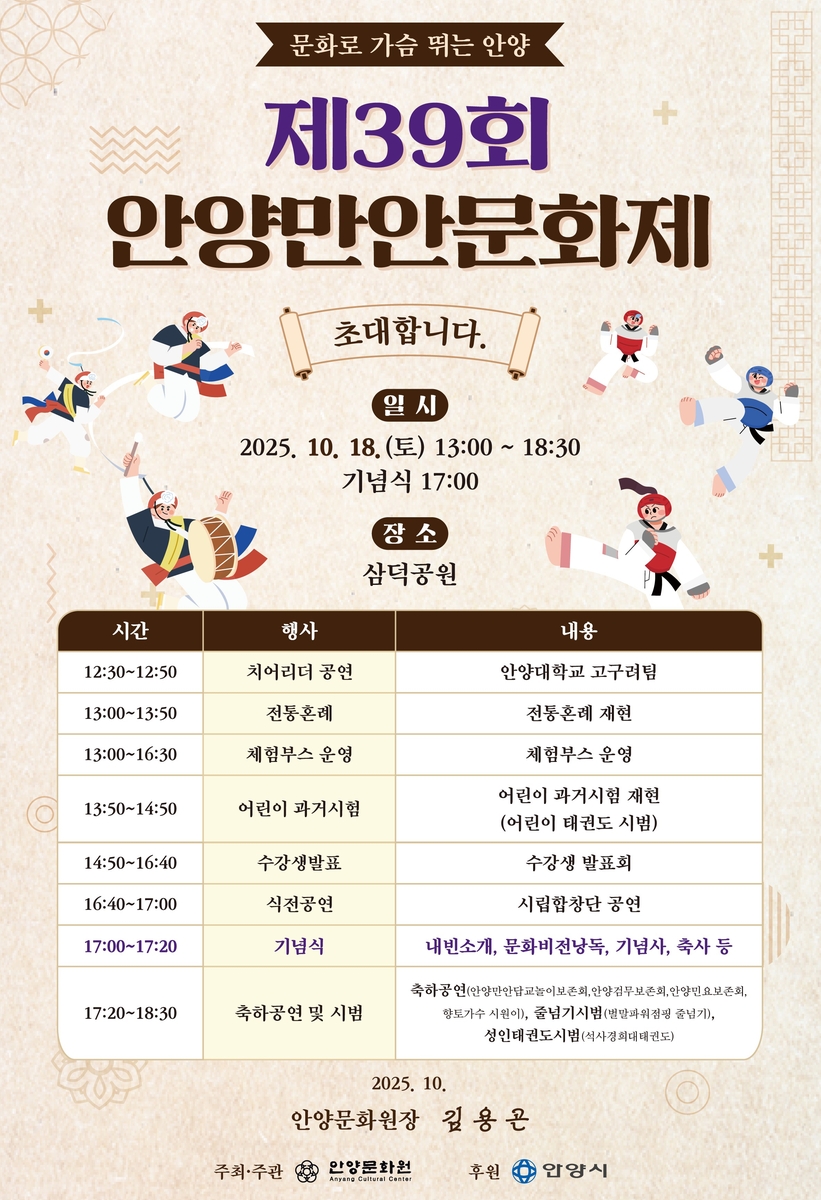 (안양=연합뉴스) 김인유 기자 = 경기 안양시는 제39회 안양만안문화제가 오는 18일 삼덕공원에서 열린다고 17일 밝혔다.