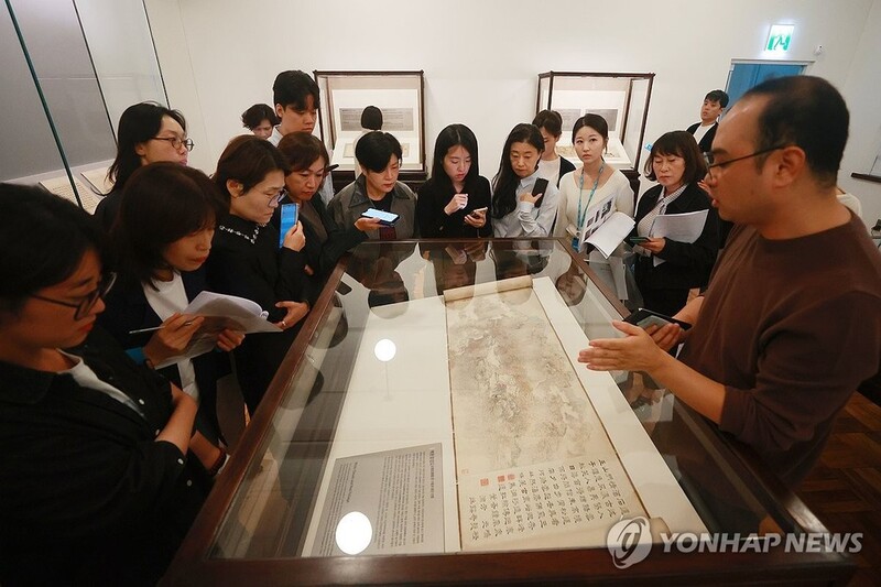 | ▲ 간송미술관, 가을 기획전 '보화비장' 개최 (서울=연합뉴스) 진연수 기자 = 15일 서울 성북구 간송미술관에서 열린 가을 기획전 '보화비장: 간송컬렉션, 보화각에 담긴 근대의 안목'에서 참석자들이 전시를 살펴보고 있다. 간송미술관이 소장하고 있는 7인의 근대 수장가 컬렉션을 공개하는 이번 전시는 국보 4건 보물 4건을 포함한 총 26건 40점의 유물을 선보인다. 2025.10.15 jin90@yna.co.kr |
