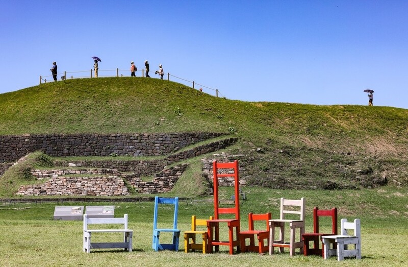 성벽 옆에 높게 보이는 솟대, 앞쪽 풀밭에 놓인 제각각 크기의 의자들이 독특한 분위기 조성에 일조하는 오브제 역할을 하는 것도 같았다.