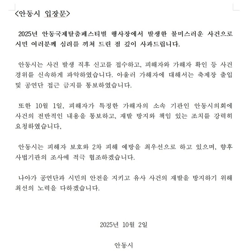 사태가 불거지자 안동시는 이날 입장문을 내고 "피해자가 특정한 가해자의 소속기관인 안동시의회에 사건 전반을 알리고 재발 방지와 책임 있는 조치를 요청했다"며 "피해자 보호와 2차 피해 예방을 최우선으로 하고, 사법기관의 조사에도 협조하겠다"고 밝혔다.