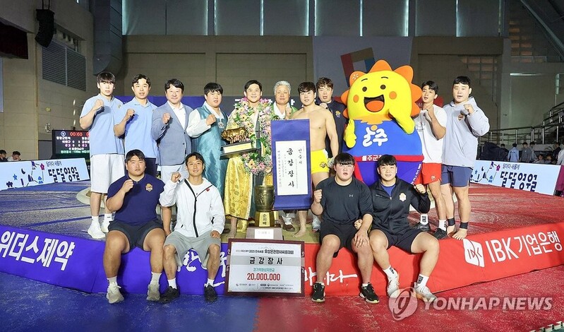 | ▲ 위더스제약 2025 민속씨름 유성온천장사씨름대회 (서울=연합뉴스) 13일 대전 유성구 국립한밭대학교 체육관에서 열린 '위더스제약 2025 민속씨름 유성온천장사씨름대회' '금강장사' 등극한 노범수(울주군청)가 동료들과 기념 촬영하고 있다. 2025.5.13 [대한씨름협회 제공. 재판매 및 DB 금지] photo@yna.co.kr |
