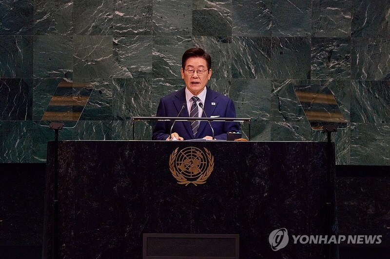 | ▲ President Lee Jae Myung delivers a keynote speech at the U.N. General Assembly in New York on Sept. 23, 2025. (Pool photo) (Yonhap) |
