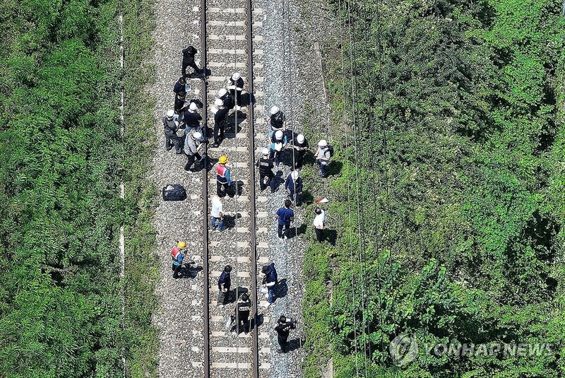 | ▲ In this file photo, police officers examine a site near the tracks of the Seoul-Busan railway in Cheongdo, North Gyeongsang Province, southeastern South Korea, on Aug. 19, 2025, after a Mugunghwa train hit seven workers inspecting structures on a slope near the tracks. The accident left two workers dead and four others seriously hurt. (Yonhap) |