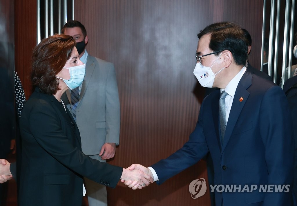 | ▲ Trade, Industry and Energy Minister Lee Chang-yang (R) and U.S. Commerce Secretary Gina Raimondo shake hands before their talks in Seoul on May 21, 2022, in this photo released by the ministry. (PHOTO NOT FOR SALE) (Yonhap) |