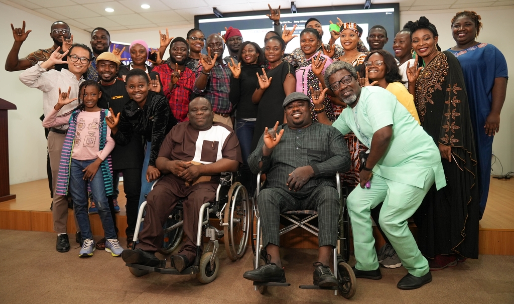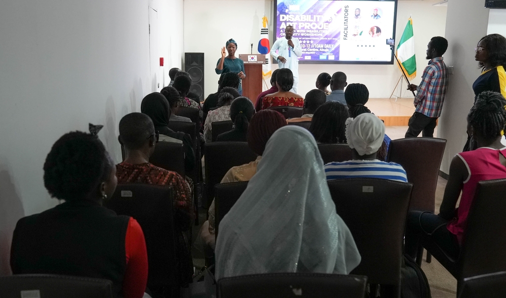 ▲ 주나이지리아한국문화원(원장 김창기)은 19일(현지시간) 문화체험 기회에 소외된 현지 장애인 30여 명을 대상으로 예술 워크숍을 개최하고 한국전시관 투어 등을 제공했다고 밝혔다. 지난 10∼11일 문화원 스튜디오에서 열린 워크숍에서 올라고케 이파티메힌(BUK 카노 대학교 연극학과장) 등 전문 강사들이 극작법, 스토리텔링법, 콘텐츠 창작법 등에 대한 강좌를 진행했다. 장애인들의 이해를 돕기 위해 전문 수화통역사와 활동보조사들도 함께 초청됐다. (요하네스버그=연합뉴스)