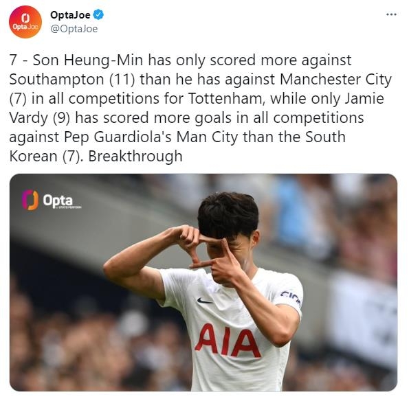 통계전문 옵타에 따르면 페프 과르디올라 감독 지휘 아래의 맨시티를 상대로 가장 많은 득점을 터트린 선수는 제이미 바디(레스터시티·9골)이고, 손흥민이 2골 차로 뒤쫓고 있다.