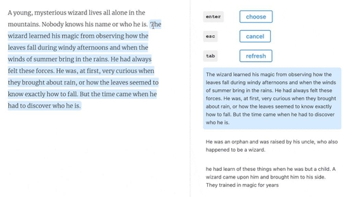 구글이 미리 마련한 사례 영상을 보면 '젊고 신비로운 한 마법사가 산속에서 혼자 살고 있다. 아무도 그의 이름이 뭔지, 그가 누구인지도 몰랐다'라는 두 문장을 입력하자 AI가 순식간에 다양한 여러 건의 후속 스토리를 제시했다. 그가 어떻게 마법을 배웠고, 어떤 능력을 갖췄는지, 자신이 누구인지 찾으려 한다는 등의 이야기가 소설 문체로 자연스럽게 이어졌다.