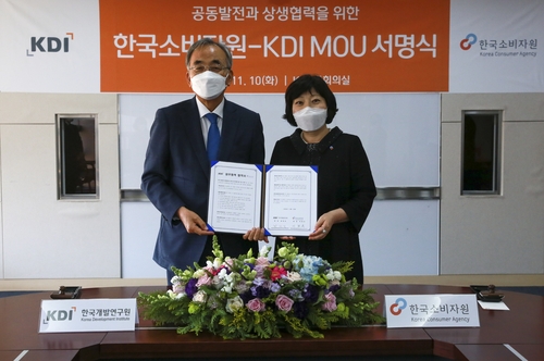 ▲ 한국소비자원은 한국개발연구원(KDI)과 소비자교육 및 경제교육 활성화를 위한 업무협약을 체결했다고 10일 밝혔다. 양 기관은 소비자·경제 분야의 교육콘텐츠를 개발하고, 조사와 교육 등을 공동 추진할 방침이다. 또 온라인 플랫폼을 통해 소비자 정보를 공유하고 전문 강사 간 교류를 진행한다. 협약에 따른 첫 사업으로 탈북민을 위한 소비생활 안내서를 제작해 보급할 예정이다. (서울=연합뉴스)