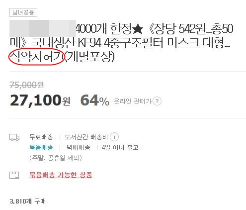 이 소비자가 구매한 제품의 경우 상품 안내 페이지에 '식약처 허가'라는 문구가 명시돼 있으며 판매 중단 이전까지 3천810개가 팔렸다는 표시가 있다.
