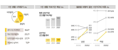 '1인 생활을 시작한 동기'에 대한 질문에 42.5%가 "자발적"이라고 답했다. 이는 2019년(39.2%), 2018년(41%)보다 높은 수준이다.