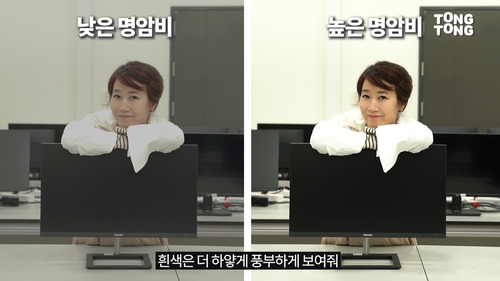 화면에서 가장 어두운 밝기와 밝은 밝기의 비율을 '명암비'라고 하는데 명암비가 높을수록 검은색은 더욱 검게, 흰색은 더욱 하얗게 보여줍니다.