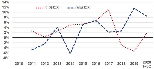 2018년 이후 민간 투자 증가율은 정부 투자 증가율을 넘어서지 못하고 있는데 올해 1~3분기 정부 투자 증가율(8.5%)은 민간투자 증가율(2.0%)보다 4배 이상 높았다.