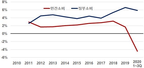 신종 코로나바이러스 감염증(코로나19) 여파로 민간 소비가 위축된 상황에서 정부 소비가 전체 소비를 떠받치는 모습이라고 한경연은 설명했다.